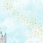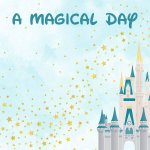 The front side of this paper has "A Magical Day" title in a fun script font. An illustrated fairytail castle, surrounded by gold star fairy dust, spread across both sides of the paper on a blue/green and white cloud background. The front side has most of the castle so you can use it alone, or (better yet!) get two sheets for an amazing two-page layout!
